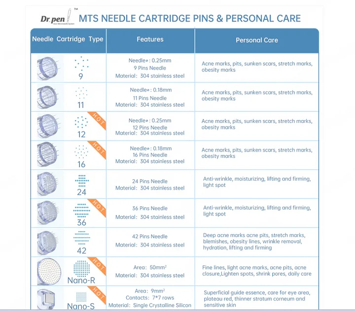 ✨These 12/36-pin cartridges, compatible with the Dr. Pen A6 microneedling pen, assist in reducing acne and boosting skin regeneration. A set includes 10 cartridges, with recommended treatment intervals of 4-6 weeks.